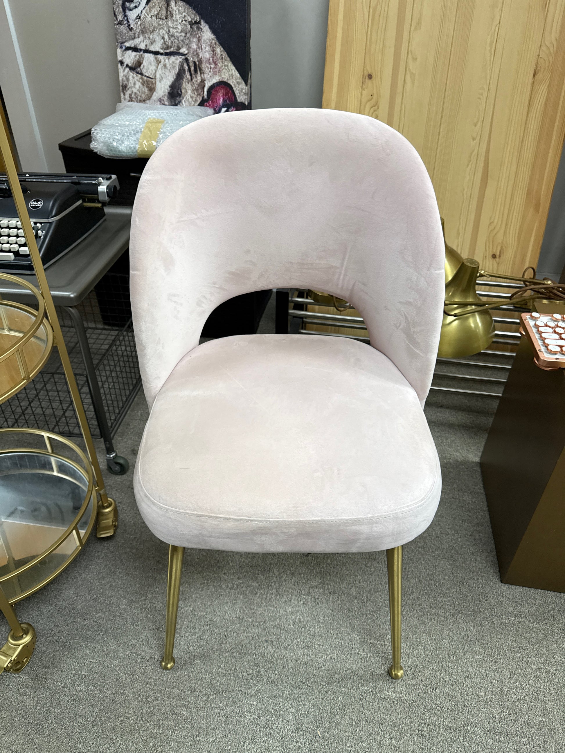 Chic blush pink velvet accent chair with a rounded backrest, soft cushioning, and slim gold metal legs. Comfortable, modern, and perfect for bedrooms, vanities, living rooms, or boutique seating. Light wear from use but overall clean and in great thrift condition.